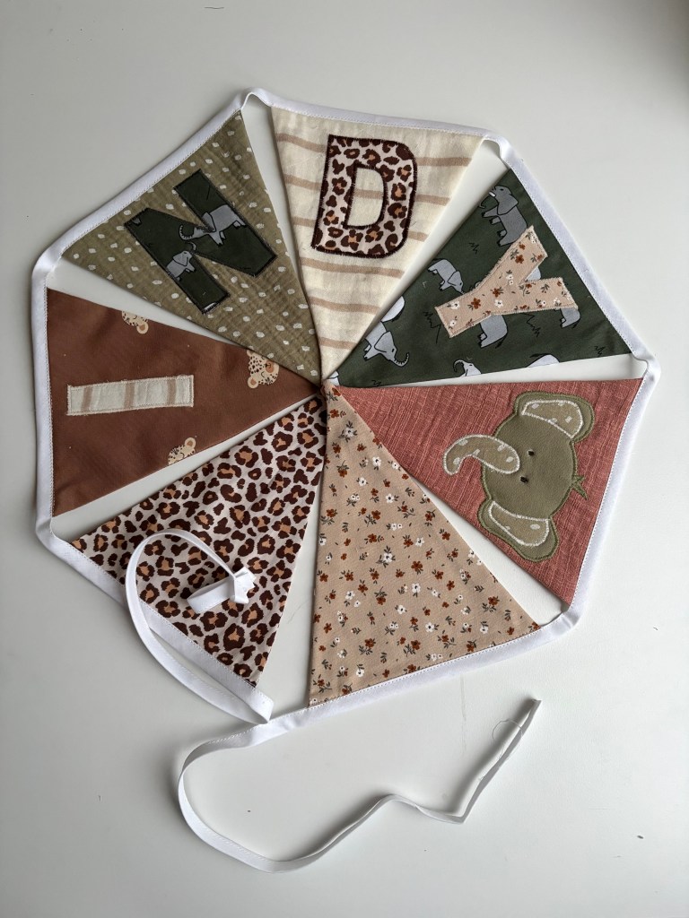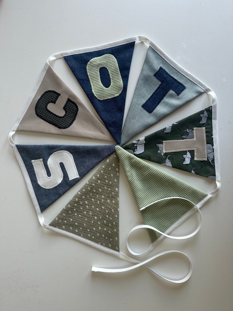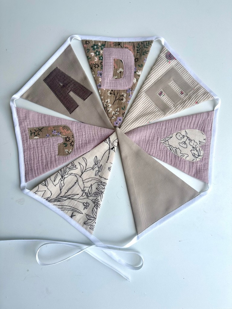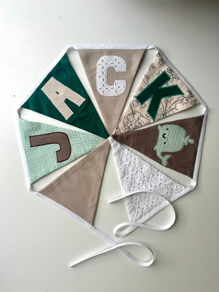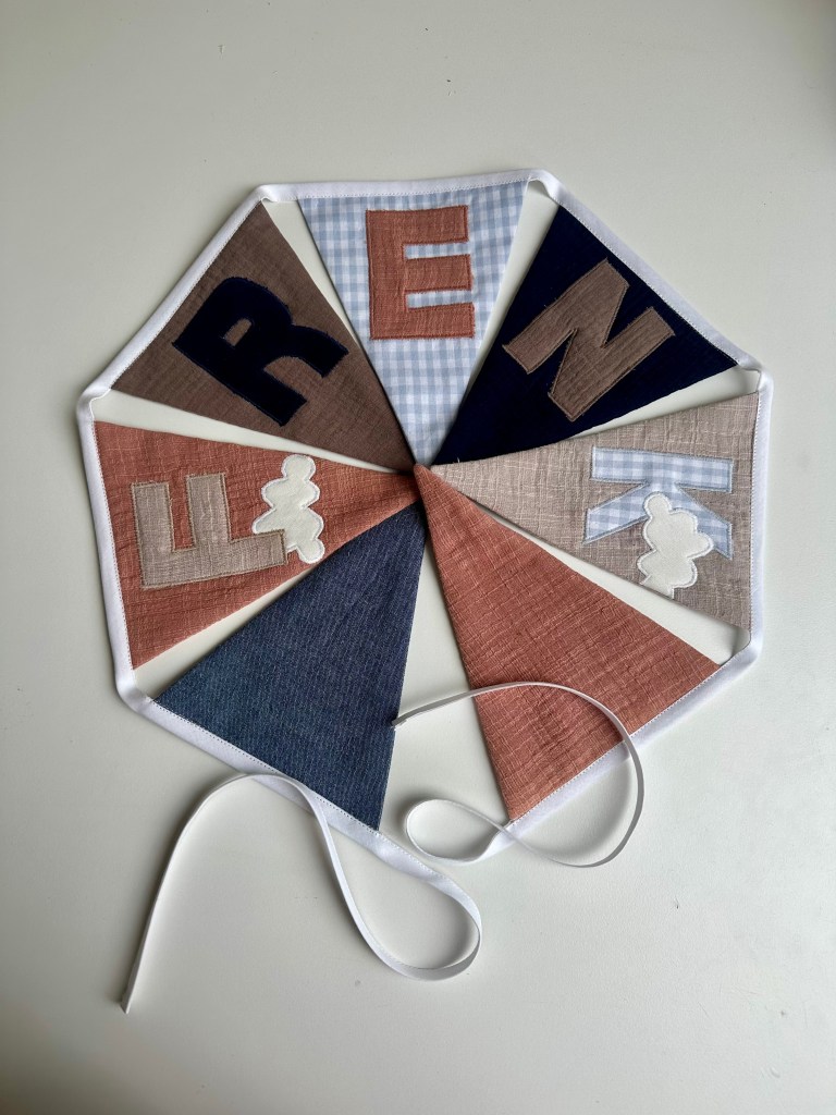 Vrolijke vlaggenlijnen, op maat gemaakt met jullie kleuren, thema en naam.